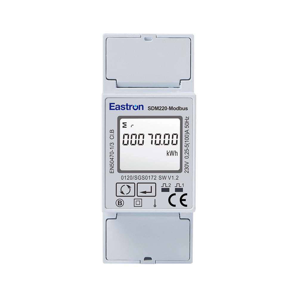 SDM220Modbus es un medidor multifunción de carril DIN monofásico de 100 A aprobado por MID para medición de carga de vehículos eléctricos. La unidad mide energía activa, energía reactiva, corriente, voltaje, potencia, factor de potencia, frecuencia, demanda, etc. La interfaz incorporada proporciona salidas de pulso y Modbus RS485. Es una buena opción para pilas de carga de vehículos eléctricos de CA de 7 kW.