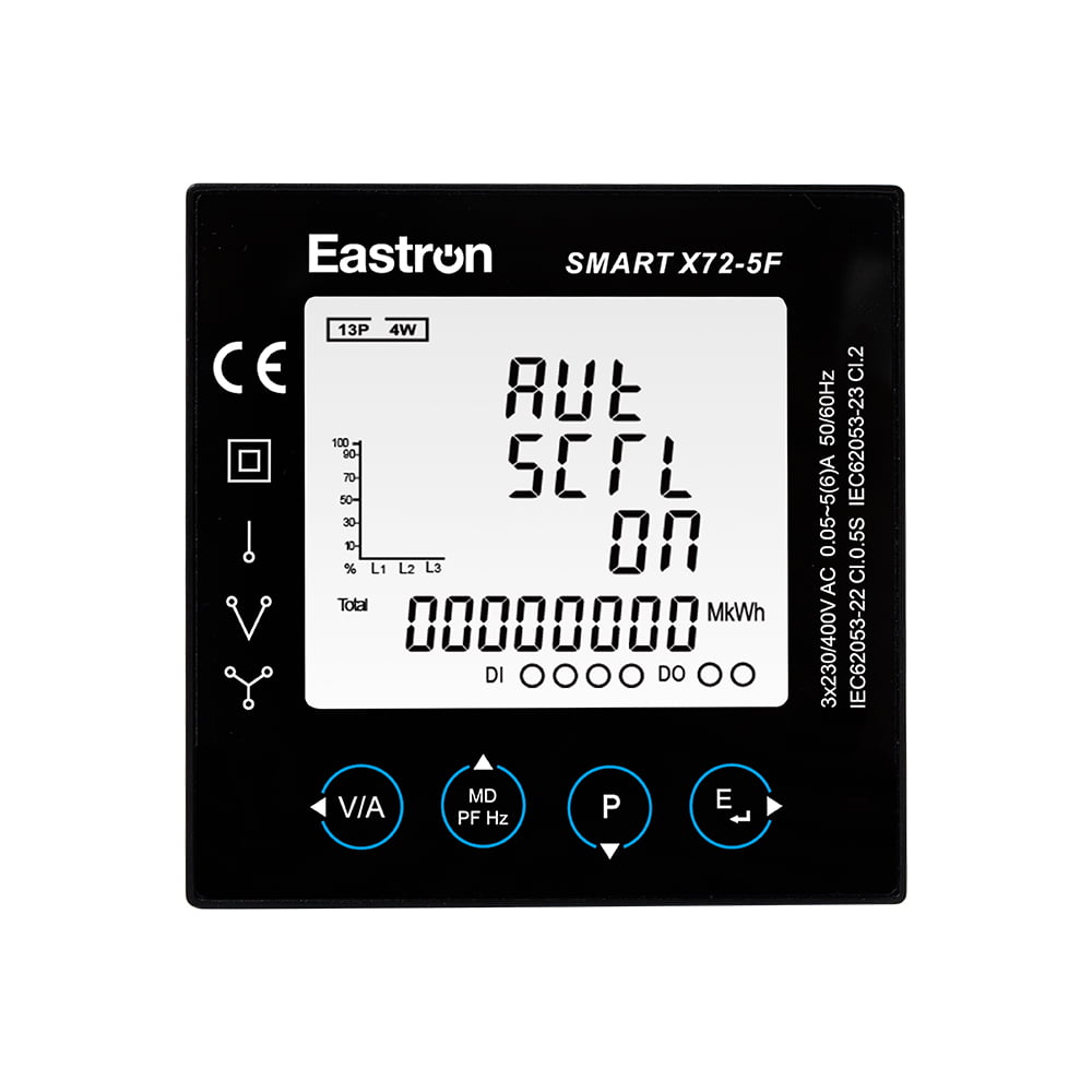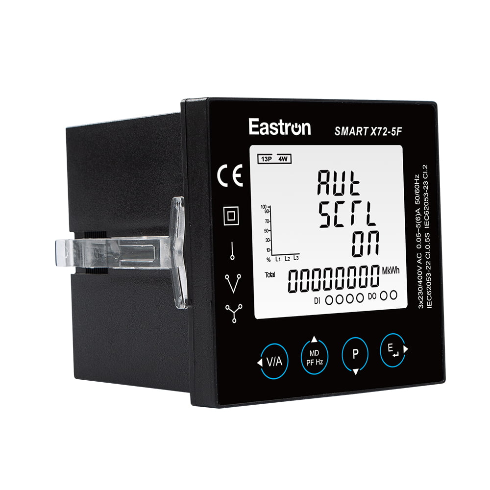 Eastron Smart X72-5F es un analizador de potencia multifunción montado en panel RS485 Modbus 72x72. Puede medir y mostrar con precisión varios parámetros de potencia en redes eléctricas monofásicas de dos hilos, trifásicas de tres hilos y trifásicas de cuatro hilos: voltaje, corriente, potencia, frecuencia, potencia activa, potencia reactiva, electricidad, importada y exportada, etc.
