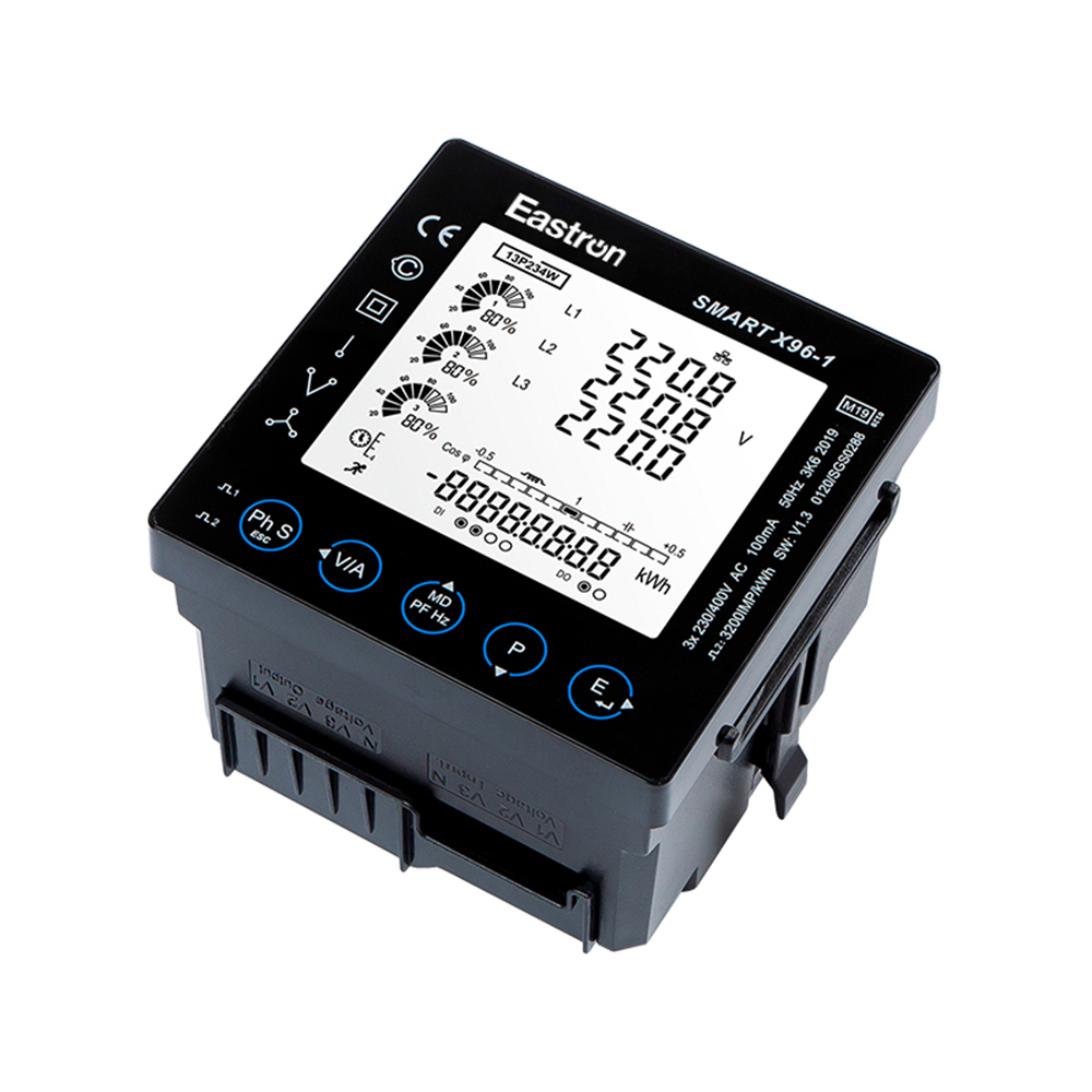 Eastron Smart X96-1A es un medidor de panel multifunción montado en panel trifásico tipo MID RJ CT para distribución de electricidad. El medidor mide y muestra las características de los proveedores 1p2w, 3p4w y 3p3w, incluyendo voltaje, corriente, frecuencia, potencia, energía activa y reactiva, importada y exportada, armónicos, demanda máxima, etc.