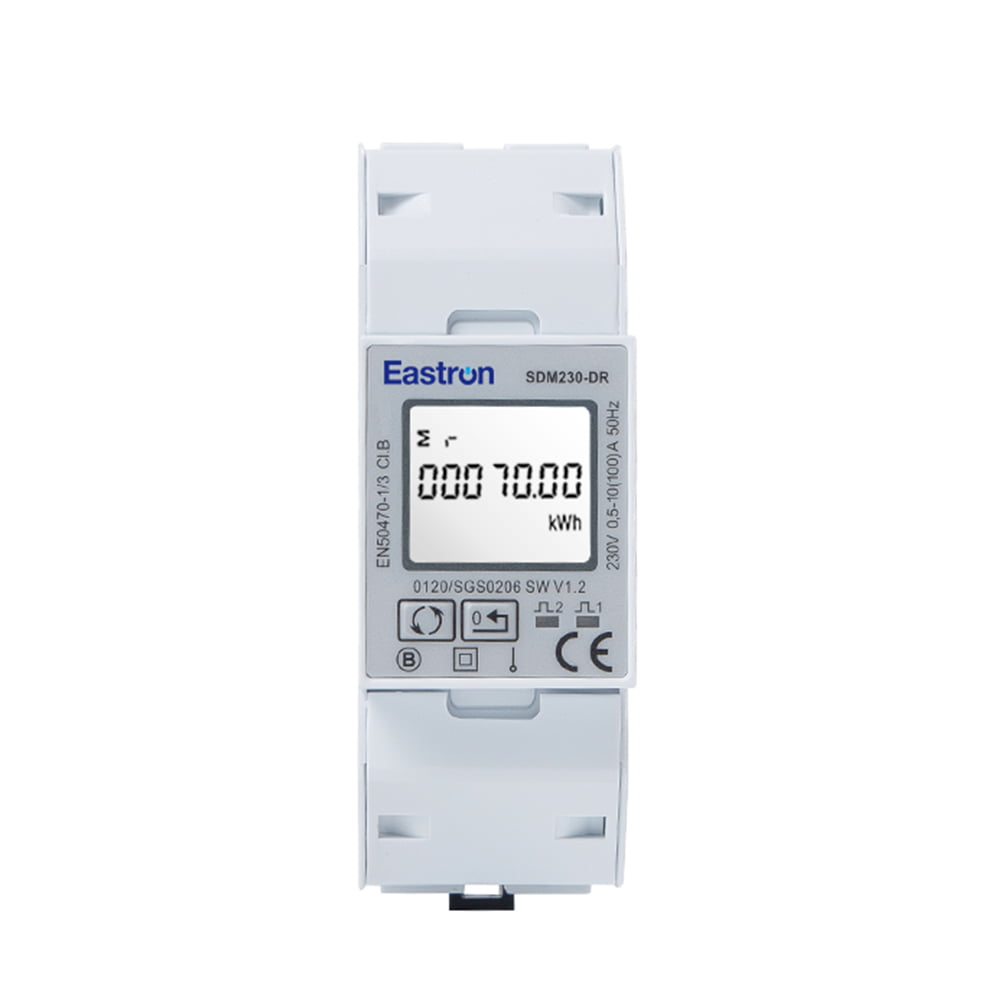 El SDM230DR es un medidor de energía ETL monofásico de carril Din para medición de potencia/kWh con salida de impulsos y pantalla LCD. Es un medidor de kWh de 2 DIN (2 módulos de 36 mm de ancho) con entrada directa máx.65 A. Proporciona una energía parcial que se puede restablecer. También proporciona una versión de medición unidireccional (anti-reversa), que se usa ampliamente en la medición de energía de generación solar.