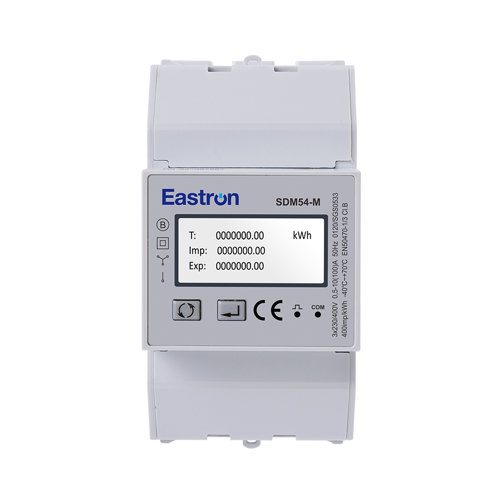 El SDM54-M es un medidor de energía MID trifásico de carril DIN Modbus RS485 de 3 módulos con pantalla LCD retroiluminada. Mide y muestra las características de suministros monofásicos de dos hilos (1p2w) y trifásicos de cuatro hilos (3p4w), incluyendo voltaje, frecuencia, corriente, potencia, factor de potencia, energía activa y reactiva, importada o exportada. La energía se mide en términos de kWh y kVArh. La demanda máxima de energía y corriente se puede medir durante períodos preestablecidos de hasta 60 minutos, de tamaño mini (54 mm de ancho), popular entre la carga trifásica de vehículos eléctricos y el sistema solar fotovoltaico, en particular el sistema Zero Export.