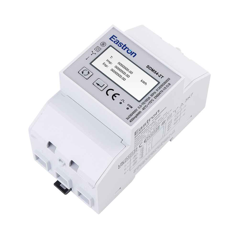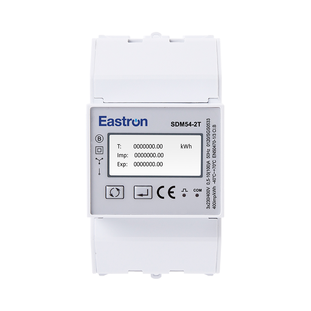El SDM54 es un medidor de energía multifunción trifásico de carril DIN RS485 de tarifa dual de 3 módulos con pantalla LCD retroiluminada. Reemplaza 2 medidores de energía que registran datos de dos fuentes de energía diferentes. Proporciona dos contadores que muestran el consumo de energía en el tablero público de electricidad (EB) y el generador diésel (DG). El medidor mide todos los parámetros eléctricos importantes, incluida la energía activa, la energía reactiva, la corriente, el voltaje, la potencia, el factor de potencia, la frecuencia, etc. Las unidades admitidas máx. Conexión directa de 100A, ahorrando costes y evitando problemas para conectar CT externos. Se proporcionan dos salidas de pulso y 1 puerto de comunicación (RS485 Modbus/DLT645) para monitoreo y configuración remota, adecuados para monitorear el consumo de energía en aplicaciones residenciales, solares fotovoltaicas, sistemas de carga de vehículos eléctricos, industriales y de servicios públicos.